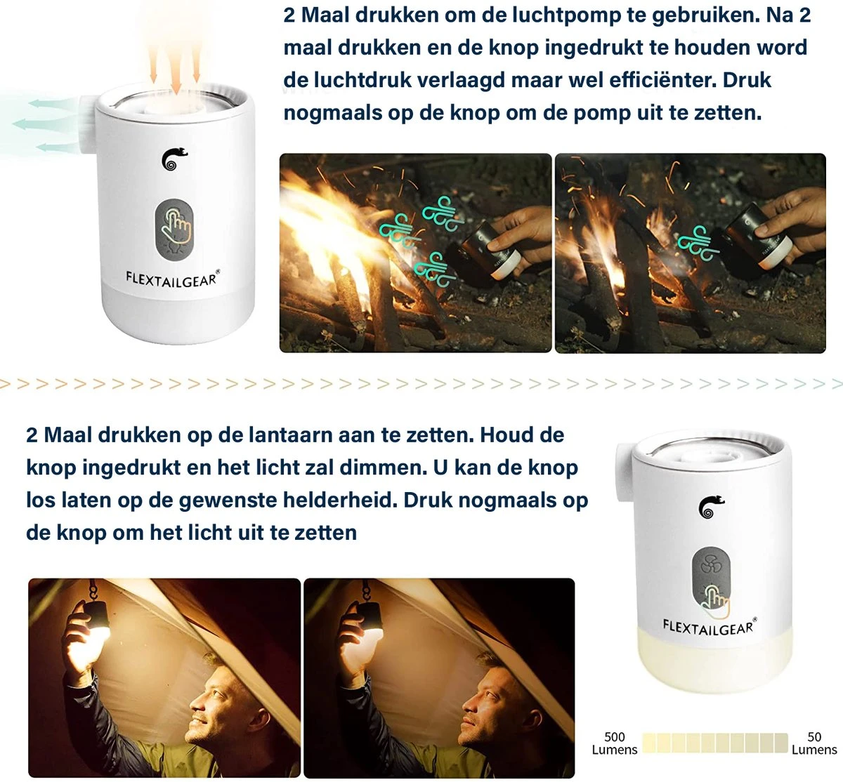 - Opblazen, vacuüm zuigen, lantaarn én nood powerbank