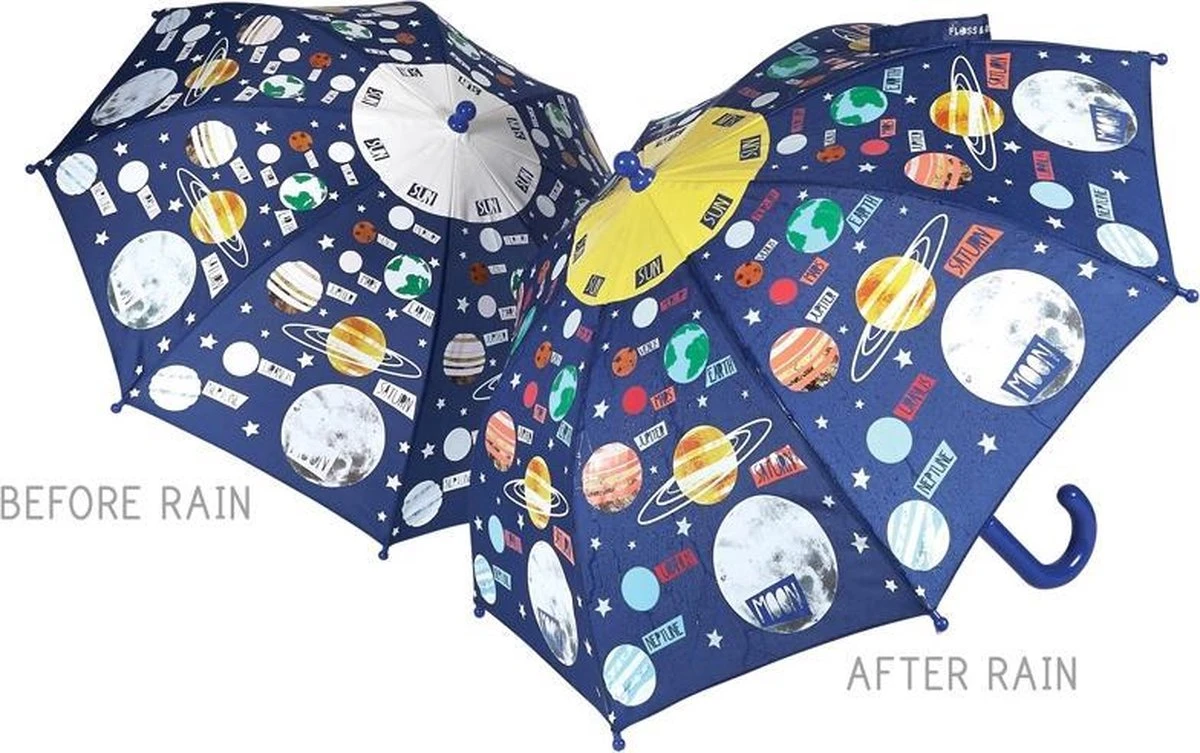 Floss & Rock Kleurveranderende Paraplu Planeten. Met deze paraplu zie je het heelal tijdens een regenbui op een magische wijze tot leven komen. Wanneer de druppels de paraplu raken zullen de planeten kleur krijgen, en verandert de witte opdruk van de paraplu in een kleurrijk sterrenstelsel. Wanneer de paraplu droogt, zullen de kleuren weer verdwijnen.