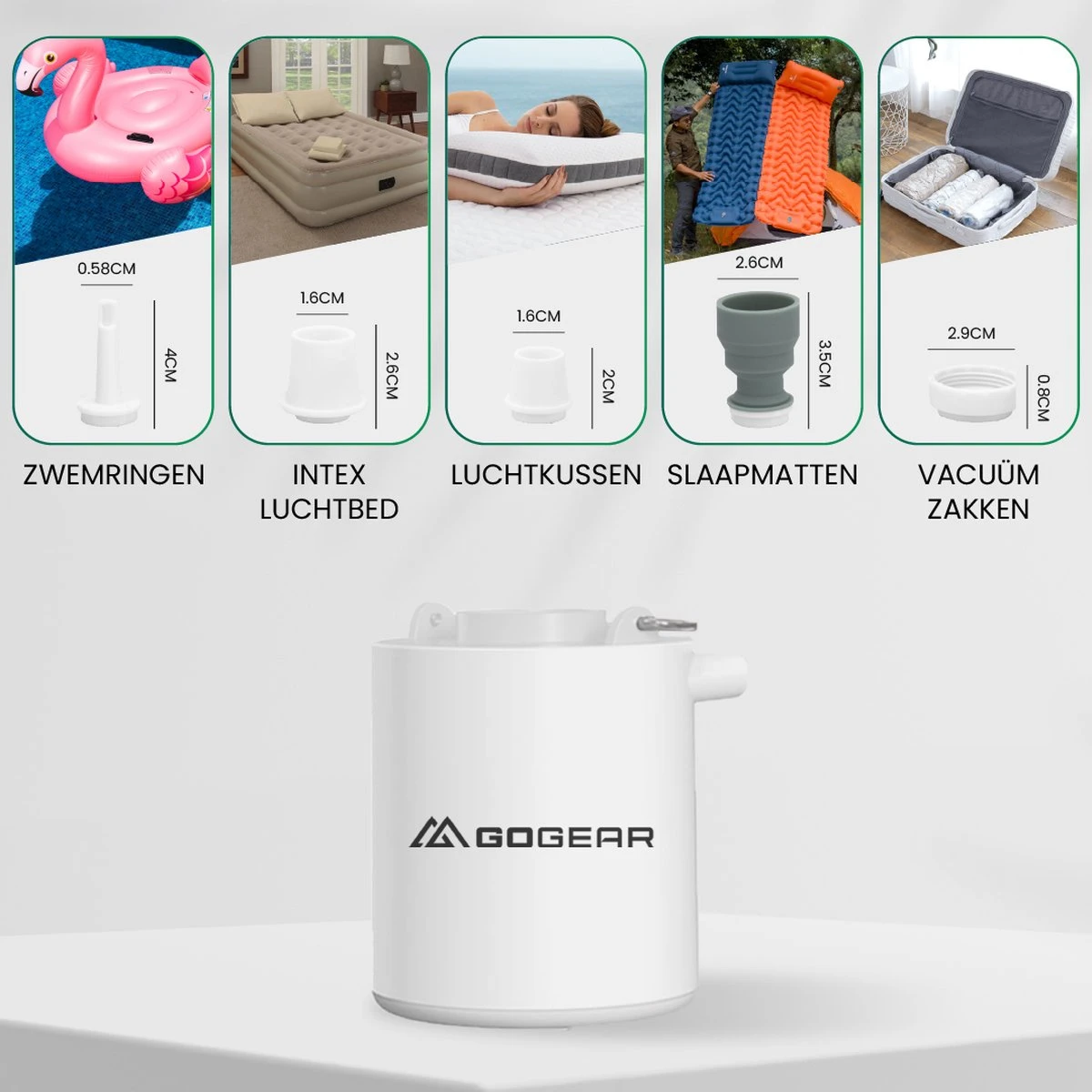 Heb je last van een zware, onhandige luchtpomp die je niet gemakkelijk kunt meenemen op reis of avontuur? Dan is de GOGEAR MINI PUMP de perfecte oplossing! Dit is s ‘werelds kleinste elektrische luchtpomp en heeft de kracht van een professionele, zware pomp, maar weegt slechts 89 gram – net zoveel als een veertje! Dit compacte en lichtgewicht pompje is ideaal voor het opblazen van je luchtbed, bootje of luchtringen, maar kan ook gebruikt worden om vacuüm te zuigen van vacuümzakken en luchtbedden leeg te laten lopen. En als dat nog niet genoeg is, kan het ook dienen als lantaarn in je tent. Ontdek hoe de GOGEAR MINI PUMP jouw problemen kan oplossen en voeg het vandaag nog toe aan je reisuitrusting!