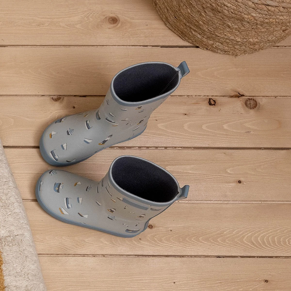 De regenlaarzen zijn gemaakt van rubber met een voering van textiel en een uitneembaar voetbed. De rubberen zool met grof profiel zorgt voor veel grip. Kortom, ideaal om droge en schone voeten te houden in het bos, op het strand of stampend door de plassen. De regenlaarzen zijn versierd met een patroon gebaseerd op de haven, passend bij het thema Sailors Bay.