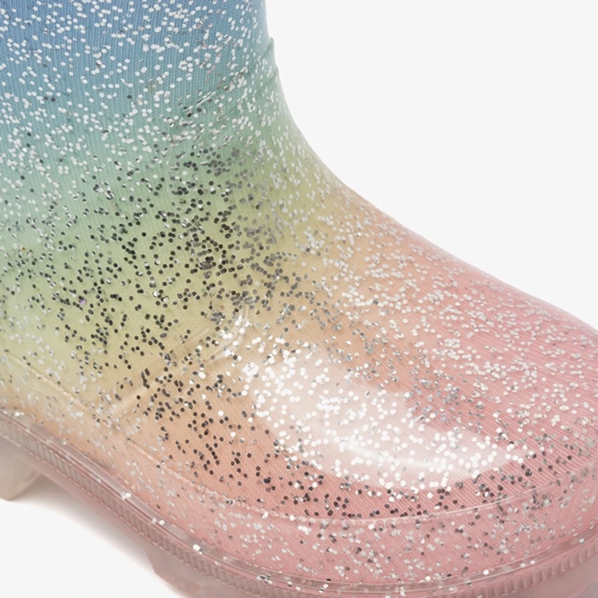 Glitter regenlaarzen met lichtjes uit de Mountain Peak collectie. De regenlaarzen zijn gemaakt van PVC. Hierdoor zijn ze lekker flexibel. De vaste binnenzool is gemaakt van textiel. De regenlaarzen hebben een rainbow print met glitters het bovenwerk en lichtjes in de buitenzool. Voorzien van een rubberen zool en ontworpen voor een all-round bescherming in verschillende (weers)omstandigheden en condities, van wandelen in het bos tot stampen in de plassen of door het zand.