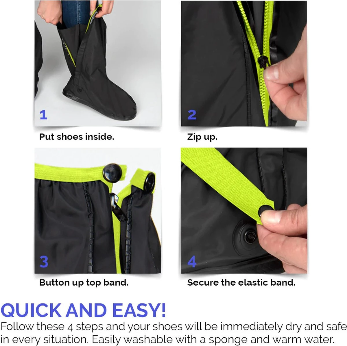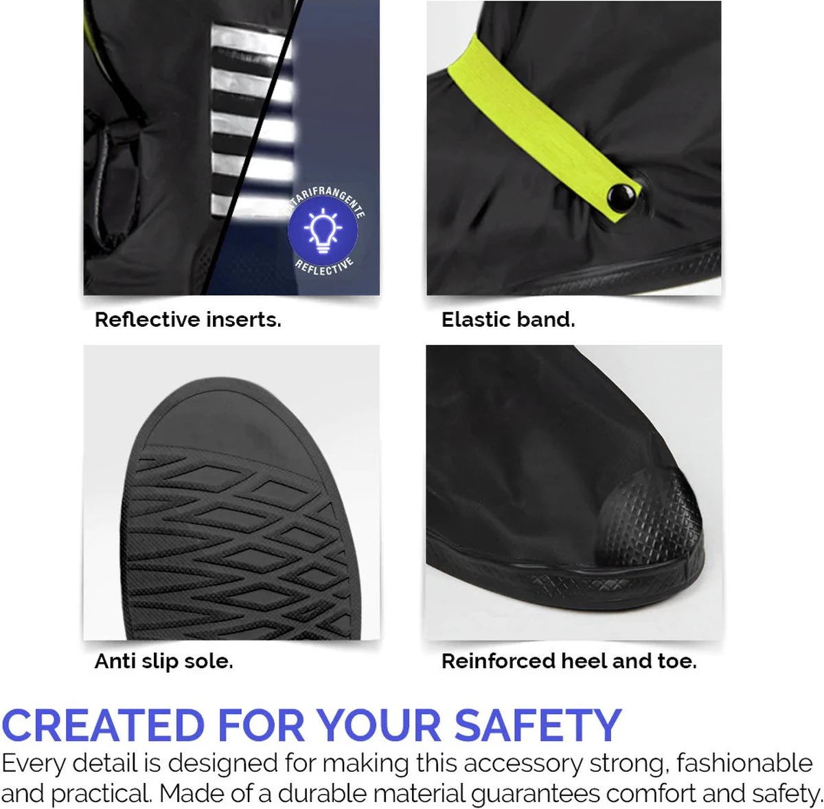 Door de reflecterende details op de waterdichte overschoenen ben je óók zichtbaar in het donker of bij stormachtig weer. In vier simpele stappen trek je de overschoenen aan, inclusief ritssluiting en elastische band met drukknoop. De antislip zool geeft je grip tijdens het avontuur!