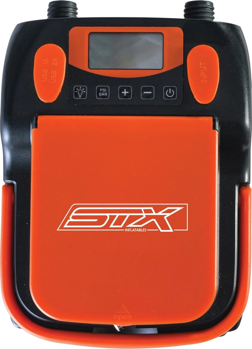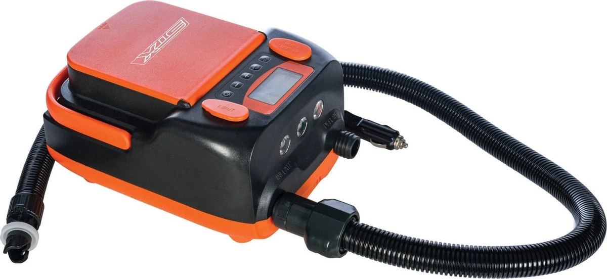 STX 12Volt pomp + accu Deze pomp kan je gebruiken voor het opblazen van je eigen SUP tot een druk van 16PSI. De pomp kun je op drie verschillende manieren gebruiken. Je kunt deze aansluiten op het lichtnetwerk dus 220/230 Volt, maar is ook op de 12V aansluiting in de auto en zonder externe stroomvoorziening, de pomp heeft namelijk een interne accu! Leeg pompen is ook ideaal, je opent het ventiel en wacht even totdat de eerste hoge druk is weggelopen, daarna sluit je de pomp aan (gewoon zonder de 12V kabel) en laat je de pomp het werk doen, snel en efficiënt. Mocht je ergens gaan suppen waarbij je geen beschikking hebt tot elektriciteit, dan werkt deze pomp dus ook op een interne accu. Testuitslag We hebben de pomp zelf getest met het STX 10.6 board (260L). Hierbij duurde het 4.30 minuten tot de 10 psi & 10 minuten voordat de SUP tot 15PSI is opgepompt. De pomp maakt in het begin weinig geluid. Zodra er volume in de SUP zit, moet de druk worden opgevoerd, op dat moment begint de pomp iets meer geluid te maken. Dit kun je sterk verminderen als je de pomp in de auto plaatst en de deur op een kier zet, op deze manier is de pomp nauwelijks hoorbaar voor de omgeving. Specificaties • Werkt op 12V via sigarettenplug in auto